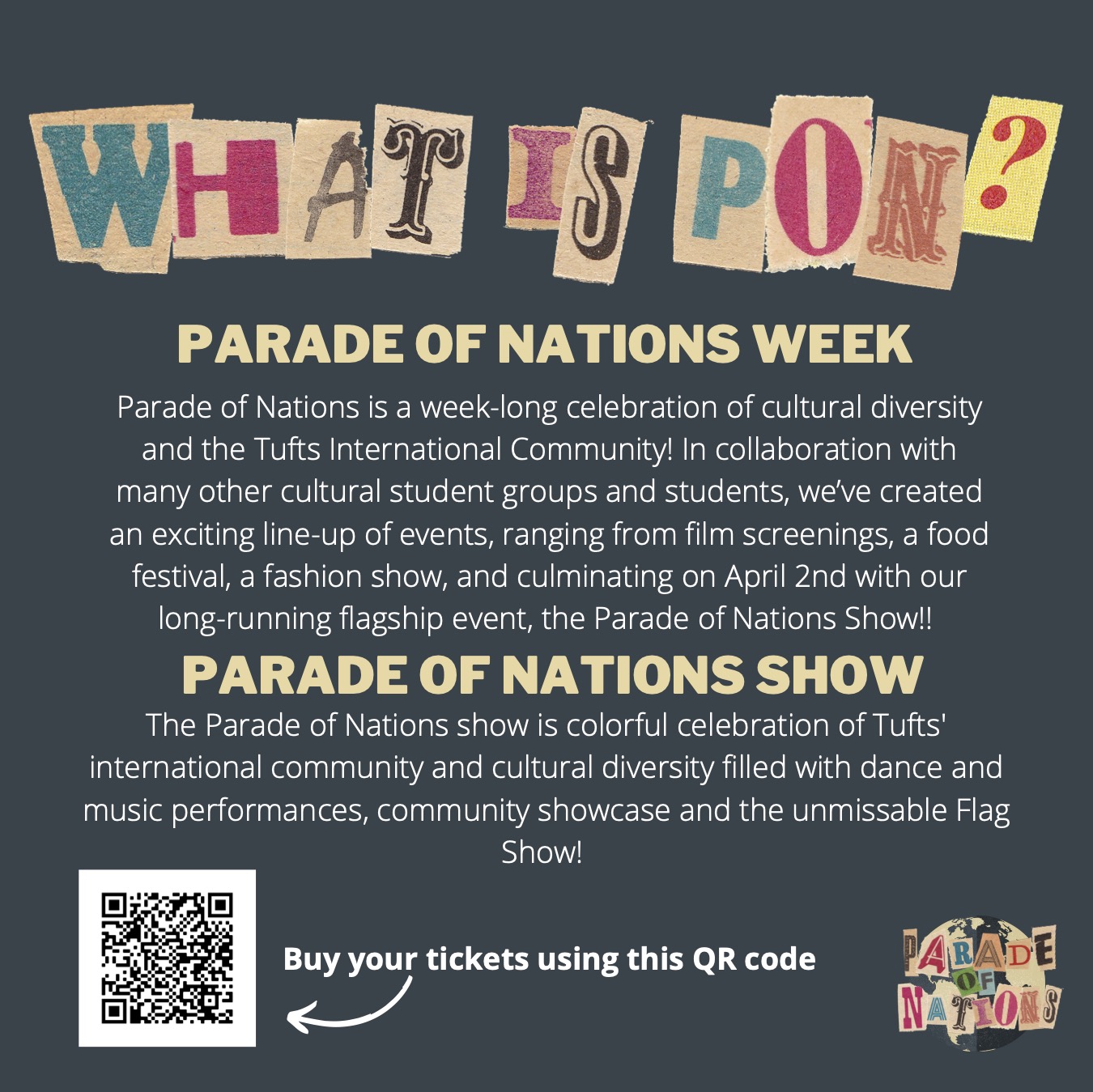 Parade of Nations is a week-long celebration of cultural diversity and the Tufts International Community! In collaboration with many other cultural student groups and students, the I-Club has created an exciting line-up of events, ranging from film screenings, a food festival, a fashion show, and culminating on April 2nd with our long-running flagship event, the Parade of Nations Show!!