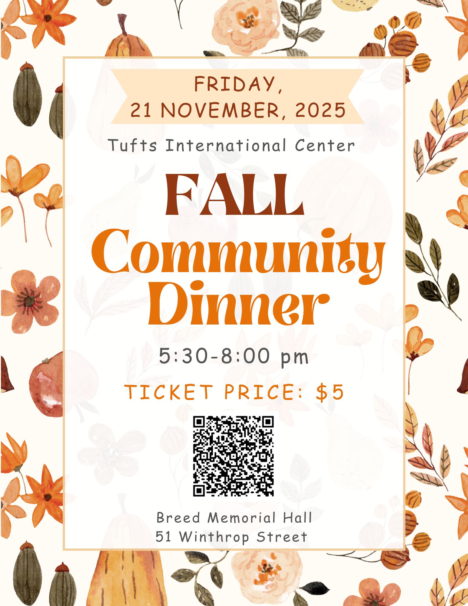 Come join the Tufts International Center for our annual Fall Community Dinner! 🍂😊 We’ll be gathering at Breed Memorial Hall (51 Winthrop Street) on Friday, November 21st from 5:30-8:30 pm to enjoy delicious food and… Read More